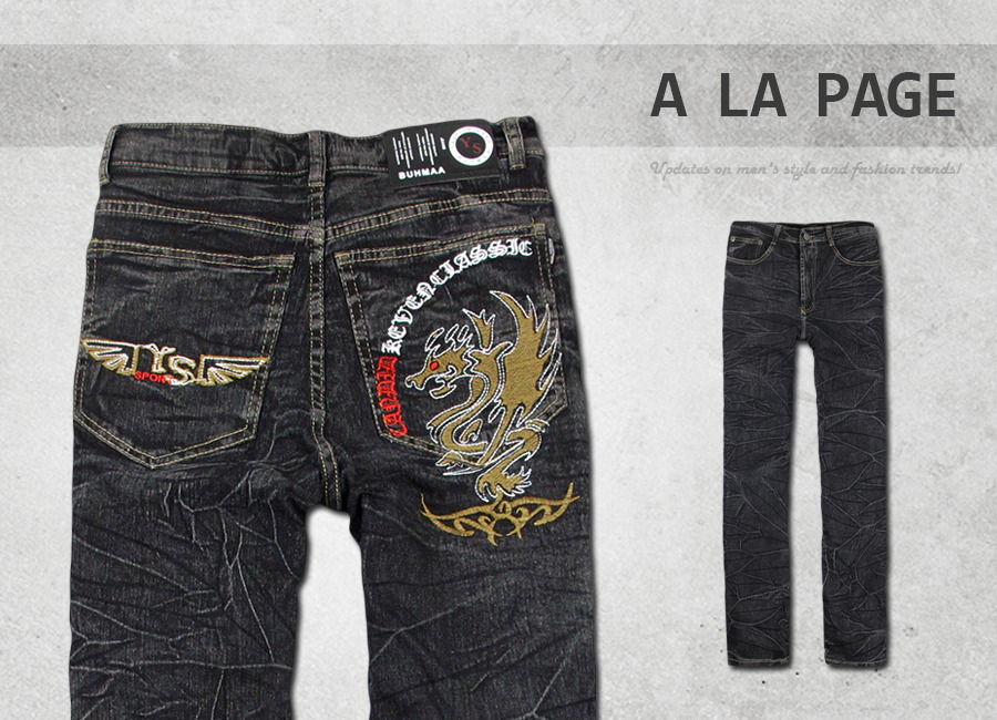 123-2115 牛仔長褲 精緻電繡復古文字龍印地安翅膀