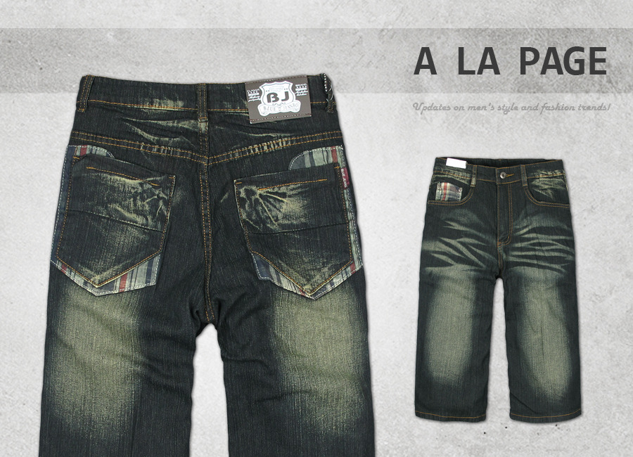 65-6952 牛仔短褲‧仿抓皺刷色.拼接條紋布